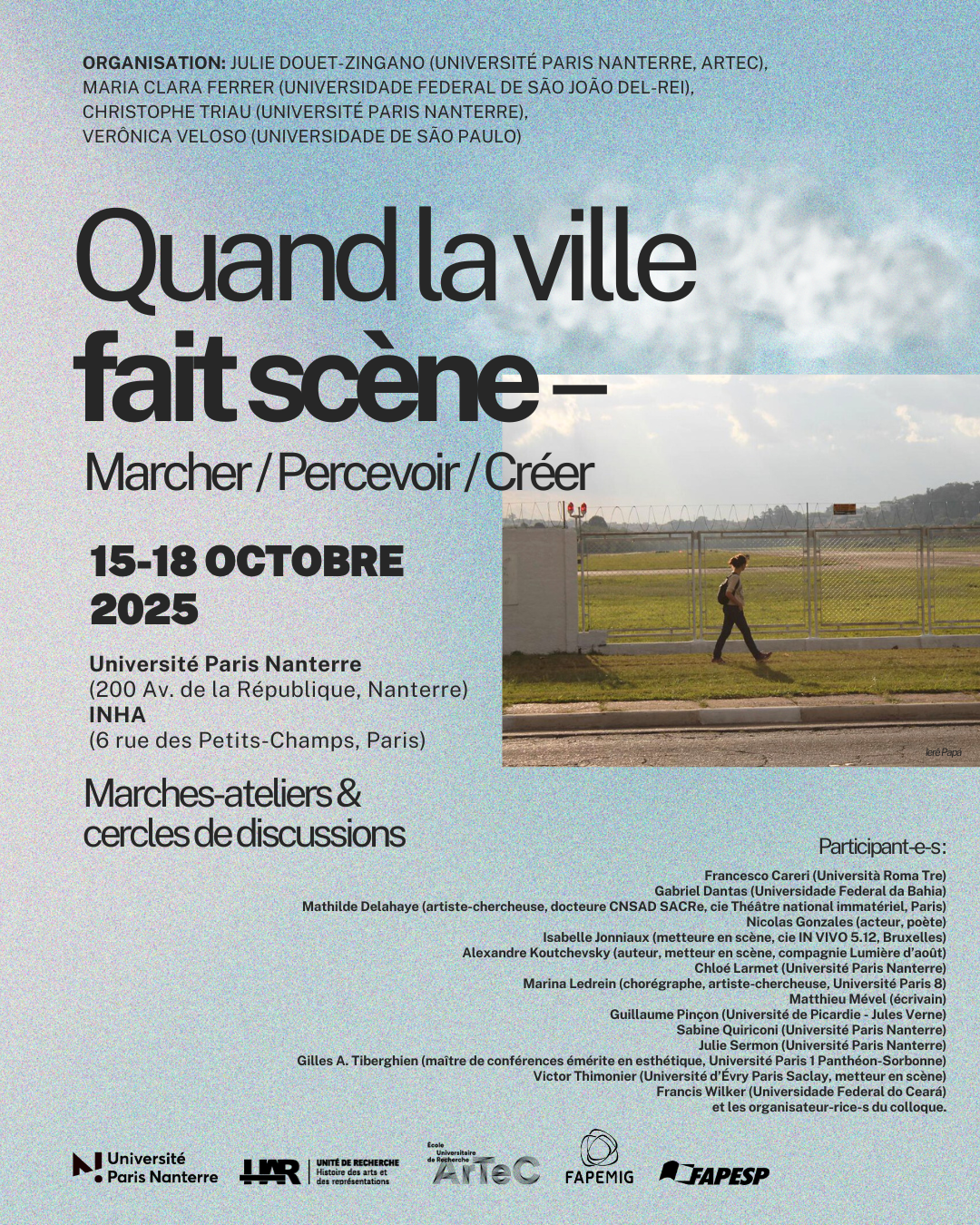 Ce colloque organise un cycle d'événements de recherche-création dédié aux pratiques de la perception en milieu urbain. Pendant quatre jours, artistes, enseignant-e-s-chercheur-se-s et étudiant-e-s en arts se réuniront autour d’activités pratiques et théoriques, visant à interroger nos manières d'expérimenter la ville. En explorant les rues, ponts et places de Nanterre et Paris, nous chercherons à redécouvrir ce que nous avons tendance à regarder sans voir, à écouter sans entendre, pour saisir les présences qui nous entourent et laisser émerger les récits enfouis.